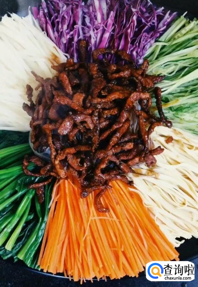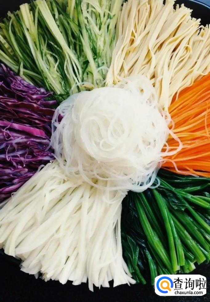 首先我们将黄瓜,豆腐干,紫甘蓝,白菜,胡萝卜全部清洗干净切丝,菠菜焯水切段,粉丝提前泡好,全部准备好以后摆入盘中备用