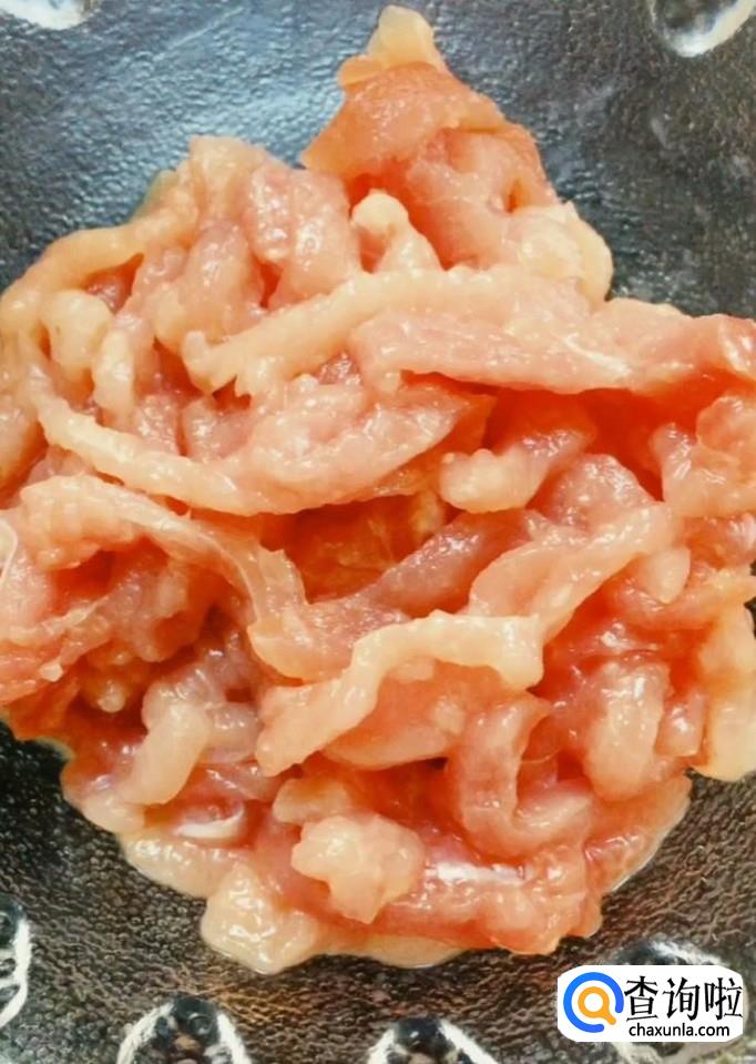 然后我们就里脊肉切成条,加入适量的料酒,盐,抓拌均匀,腌制两分钟