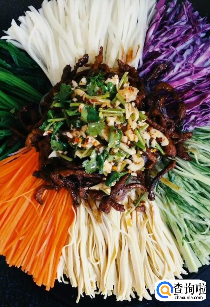 菠菜,黄瓜,豆腐干,紫甘蓝,胡萝卜,白菜,粉丝,里脊肉,料酒,酱油,香菜,蒜,盐,味精,白糖,香醋,辣椒油,香油