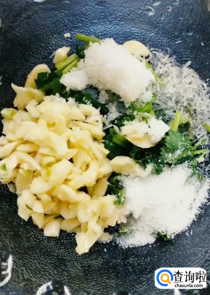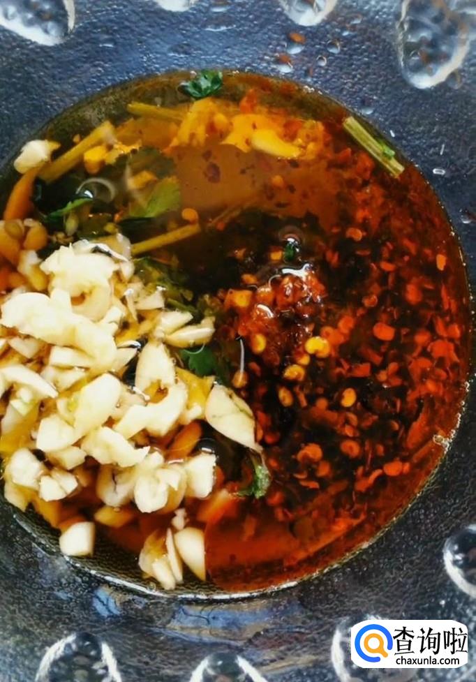 然后我们在一个碗中放入蒜末,香菜,放入适量的盐,味精,白糖,再倒入适量的香醋,辣椒油,香油,搅拌均匀做为料汁