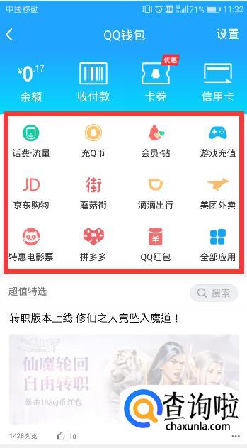 左侧页面出现后,点击qq钱包。