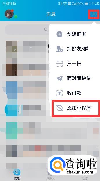 进入手机qq页面,在qq页面点击右上角“+”选择最后一个“添加小程序”。