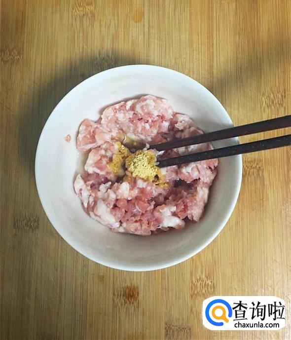 肉糜放入碗中,依次加入1小勺料酒和生姜粉,搅拌均匀。