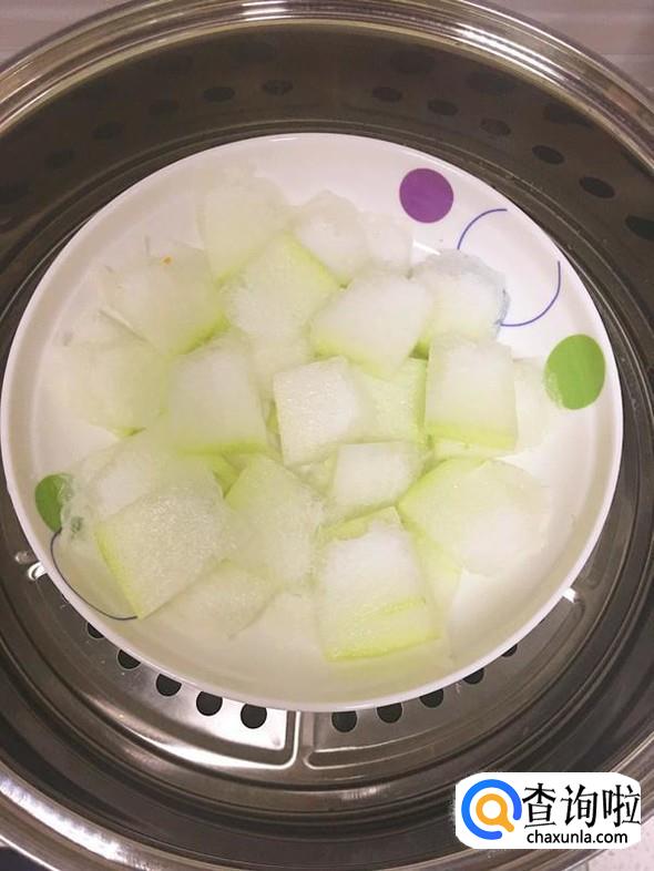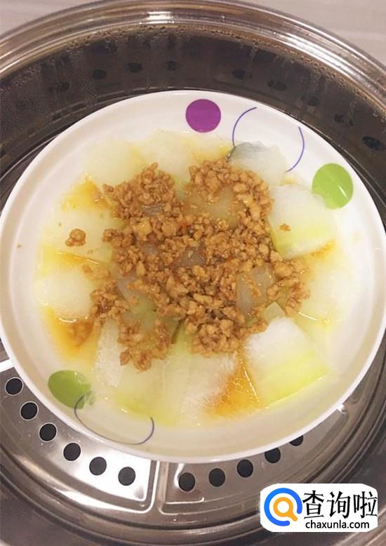将炒制好的肉糜连带汁水一起倒在冬瓜块上,继续蒸制2分钟左右。