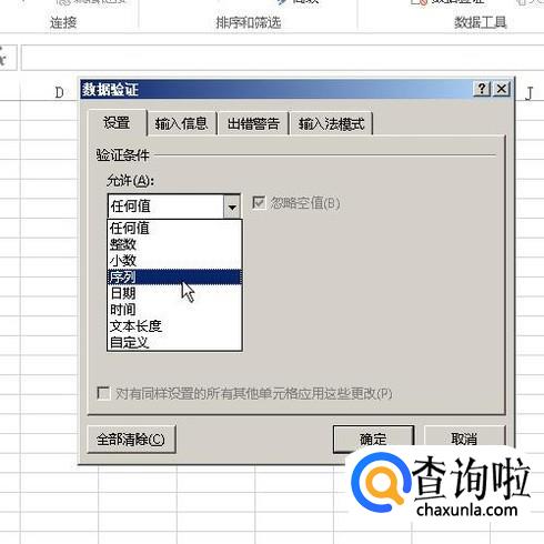 即时弹出数据验证的面板,在允许这里点击其下拉按钮,再点选:序列;下面来源的这一选项的设置按你实际要求来设置了。设置完毕点确定即可。