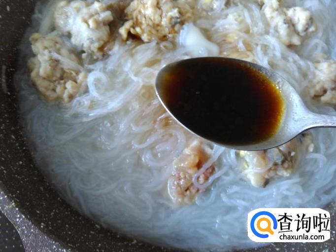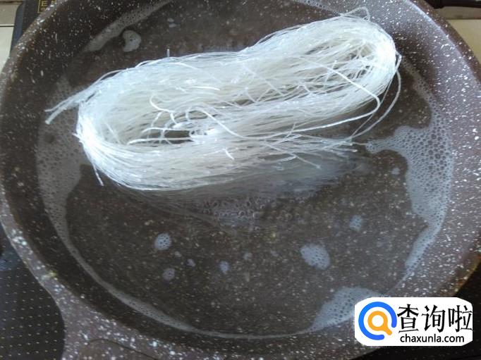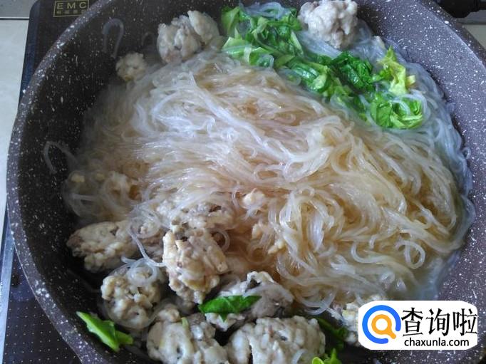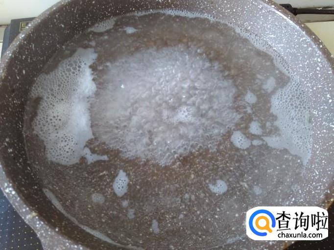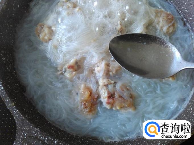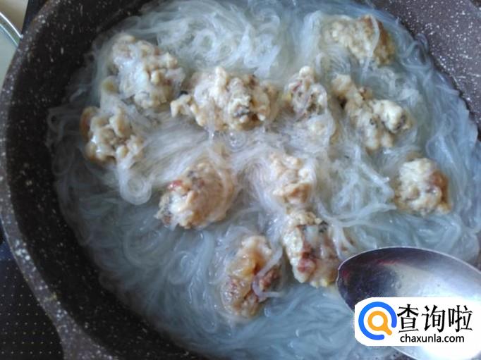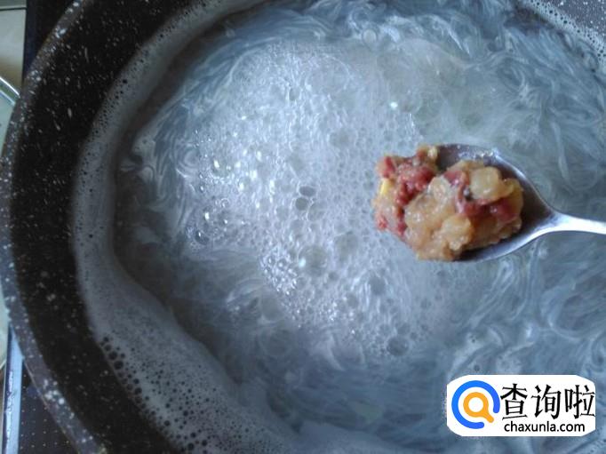 然后放丝粉进去,煮沸后再煮2分钟,然后用勺子把鱼胶装到锅里。