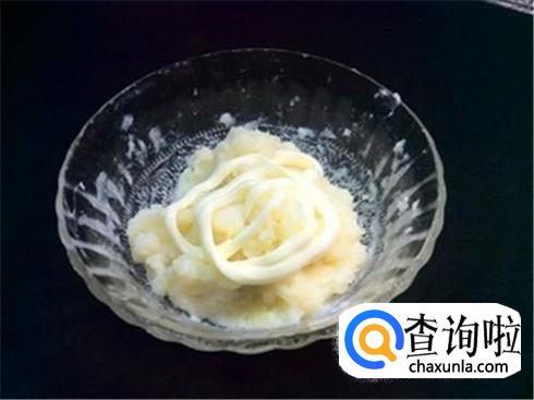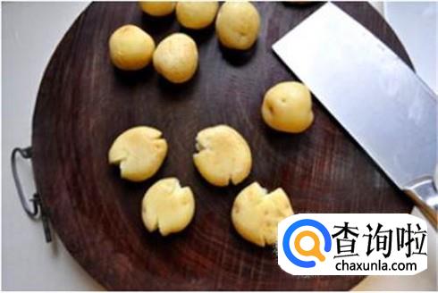 土豆蒸熟之后,将土豆皮去掉,然后把土豆切成块,用擀面杖或者其他干净用具将其压扁成泥状。