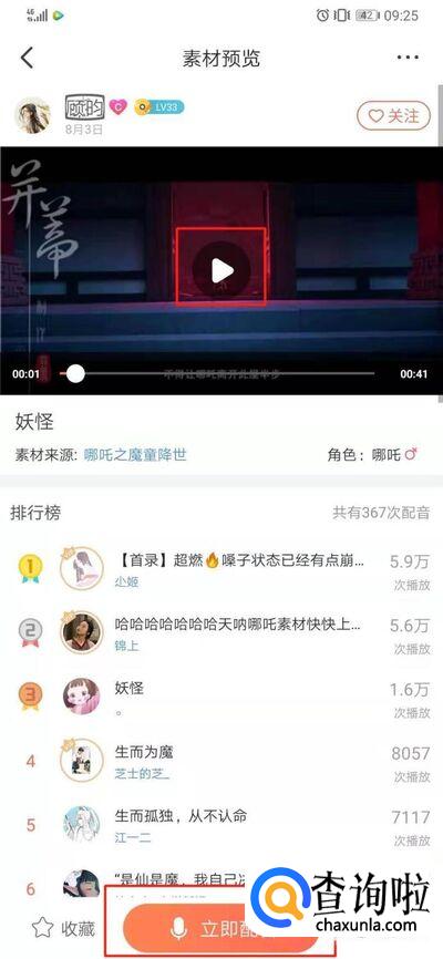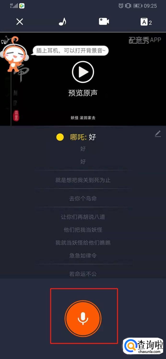 点击素材进去后,先预览一下原来的效果。可以多听几遍哦,然后点击录音就可以自己配音了。尽量把你的配音对上他的嘴型,而且你不能有念错的地方。