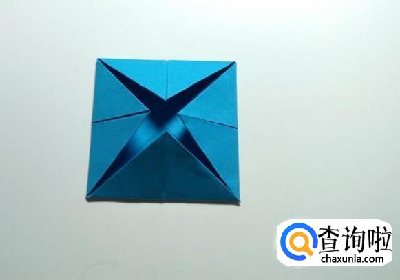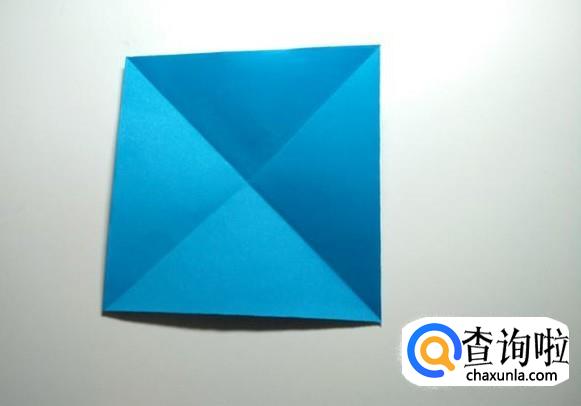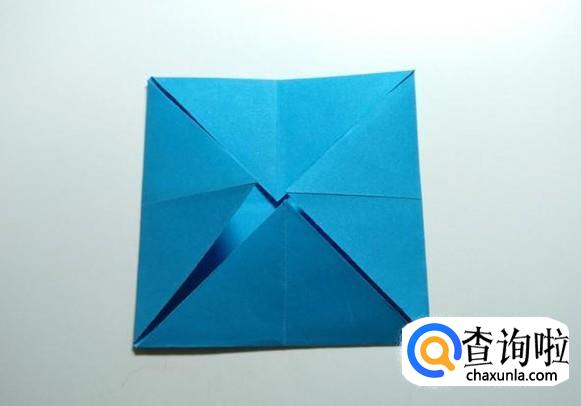 先将正方形纸沿对角线对折后打开,然后把折纸的四个角分别折向中心。