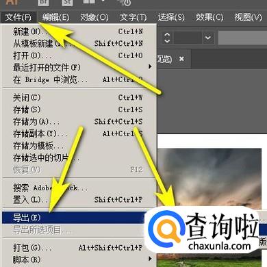 关闭透明度面板,点击文件菜单,再点:导出,再点:导出为
