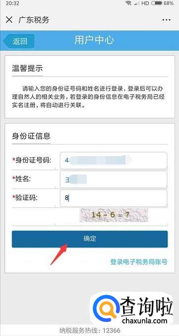最后我们直接输入身份证号码和名字,填完验证数字点击确定即可。