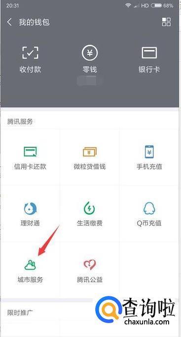 首先我们登录微信后进入到微信钱包里面,点击下方的城市服务。