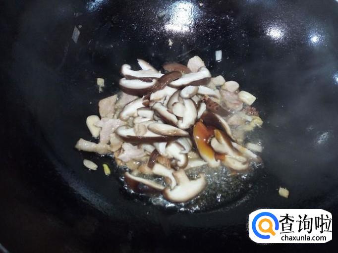 炒至肉颜色微白,放入葱,姜,蒜,翻炒,放入少许酱油。随即放入香菇翻炒,放入料酒,放入一小匙儿蚝油。