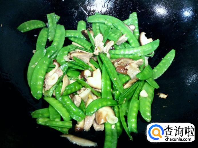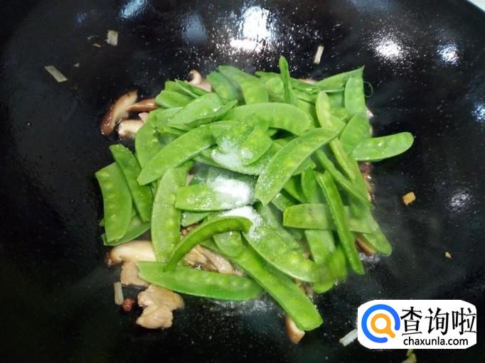 香菇略翻炒一下,放入荷兰豆翻炒,放入盐。炒至荷兰豆断生,放入味精,关火出勺。