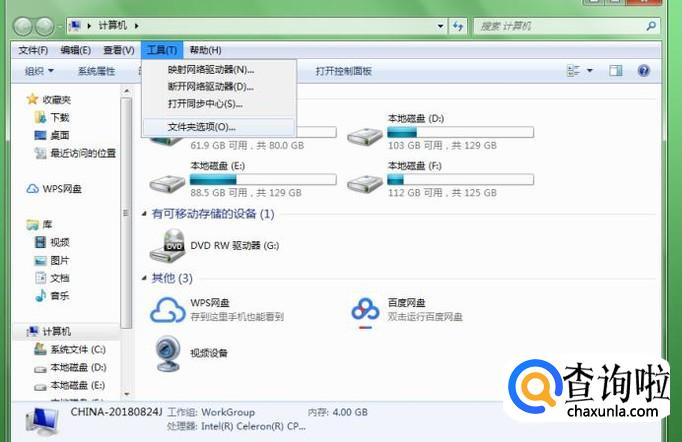 然后打开“计算机”进入,在菜单栏里面找到“工具——文件夹选项”进入。