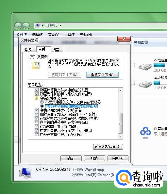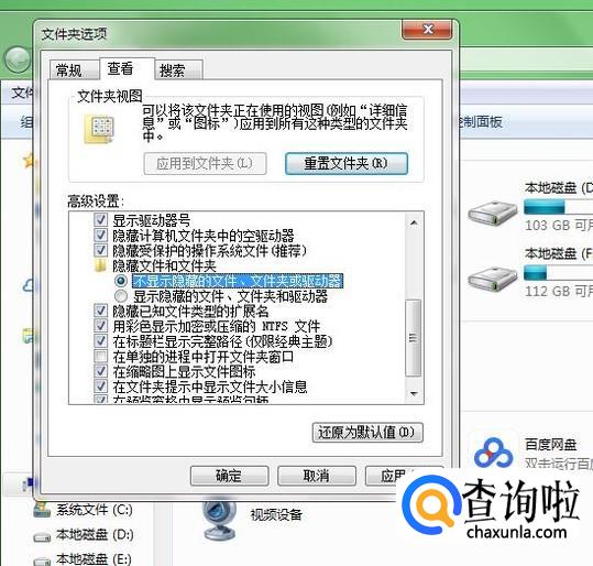 进入“文件夹选项”后,点击“查看——高级设置”,在里面找到“隐藏文件和文件夹”,选择“显示隐藏的文件、文件夹和驱动器”后点击确定。