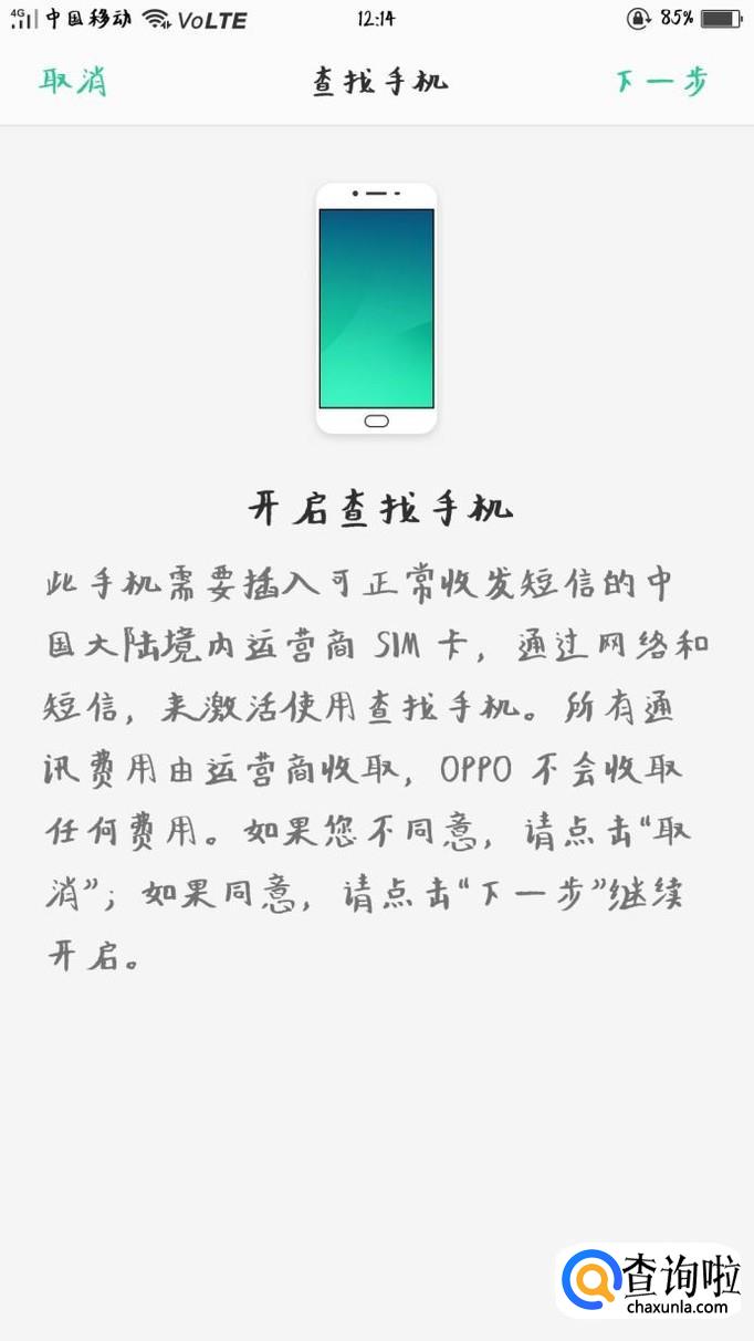 点击“查找手机”,进入开启界面,点击“下一步”。
