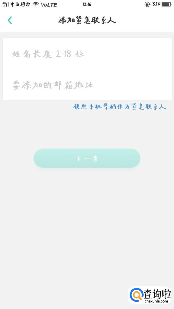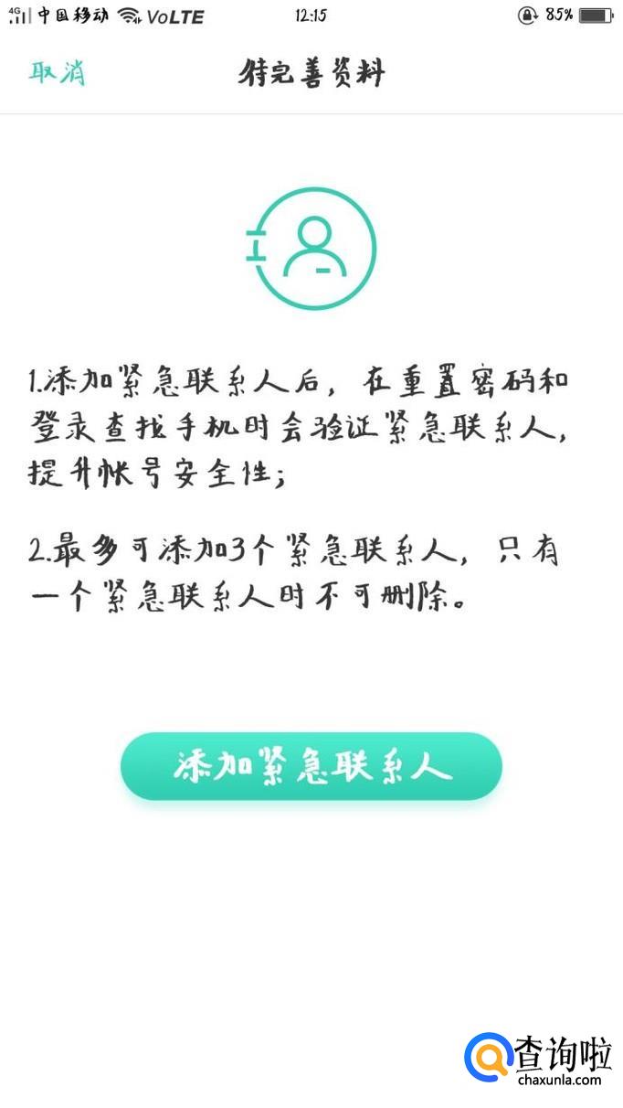 成功登陆账号后进入添加紧急联系人界面,可以使用邮箱或者手机号码作为紧急联系人,提升帐号安全性。