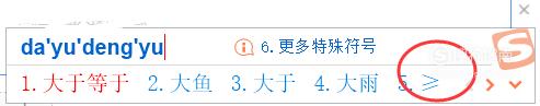现在的输入法可以通过智能匹配找到符号,我们输入“大于等于”的时候,输入法就会显示这个符号了。
