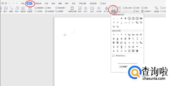 打开“word”文档,在菜单栏中先选择“插入”,在其页面下选择“符号”,找到该符号。