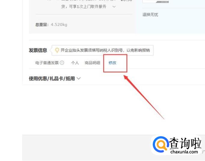 最后,当购买了商品之后,在订单提交页面中,发票内容选项中,点击“修改”按钮。