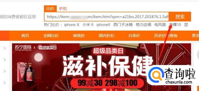 然后我们将网址粘帖于慢慢买首页的“比价”栏目后点击“搜索”。