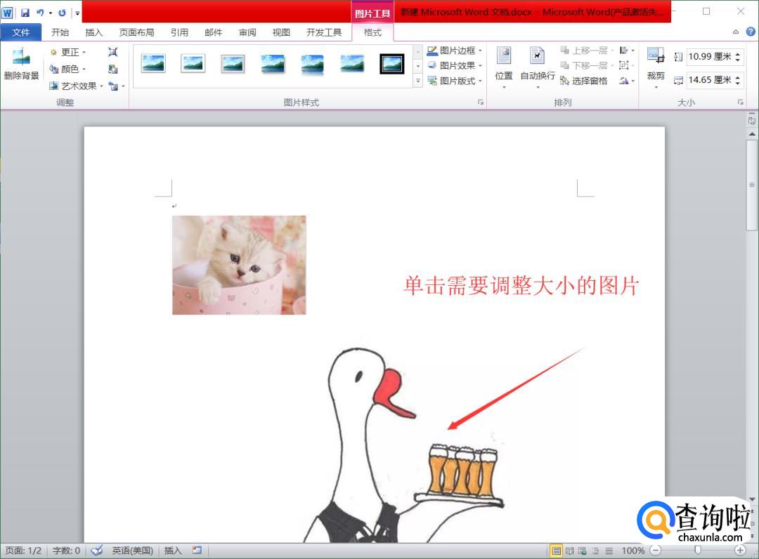 插入图片之后我们会发现图片不在同一张A4纸上,这时我们单击需要调整大小的图片。