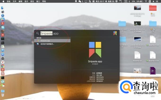 要给图片进行添加马赛克,则只能够在截图的时候添加。因此先是在键盘上按cmmand+sapce,然后在这个搜索框输入软件的名称Snipaste,按一下return按键启动软件。