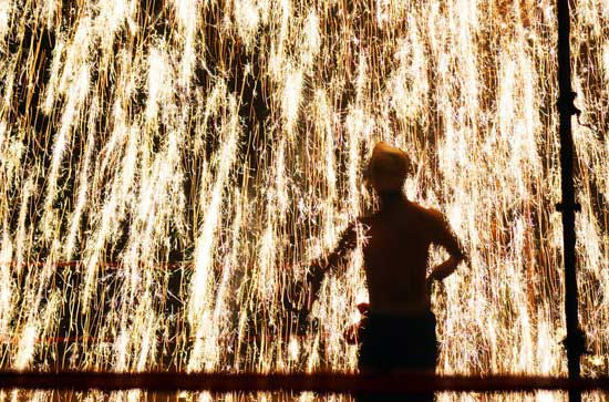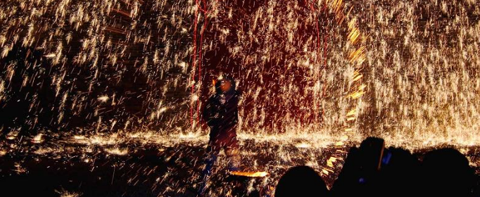 表演者手中拿着两根木棒,木棒前端是镂空的,可以灌进铁水,然后两根木棒进行敲击,铁水瞬间飞溅形成万千铁花。