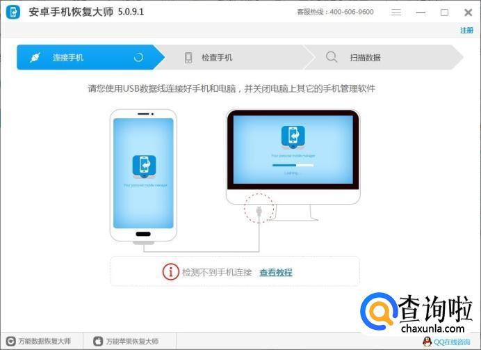 恢复数据前必须要确保手机获取root权限,连接电脑手机