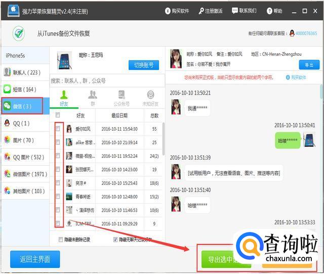 选择需要恢复的数据类型,比方说“微信”,接着在软件右侧即可查看到微信记录。勾选出需要恢复的记录后,点击“导出选中记录”,若是想要批量恢复记录,直接点击“导出全部记录”即可。