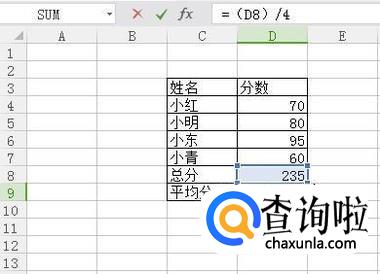 接着在D9单元格输入“=(D8)/4”,如下图所示。