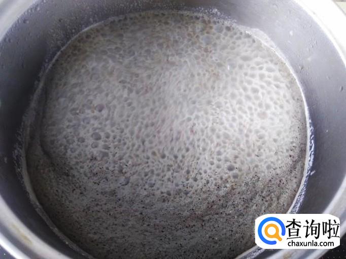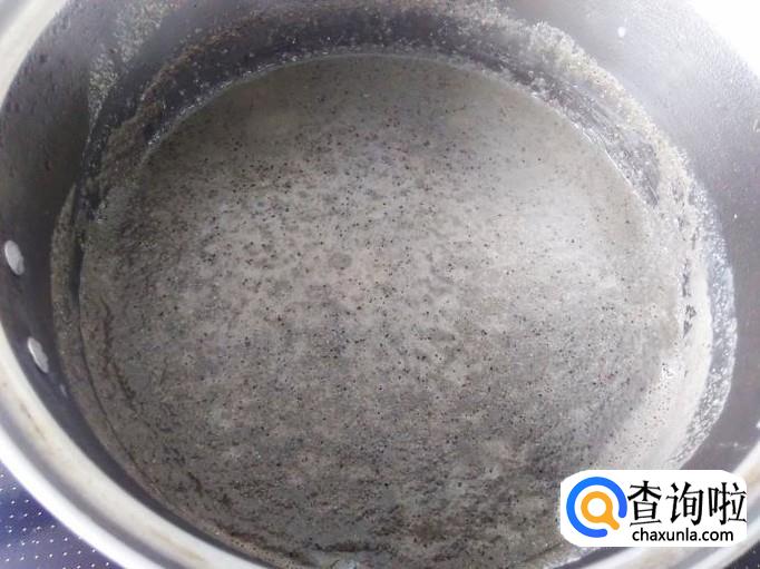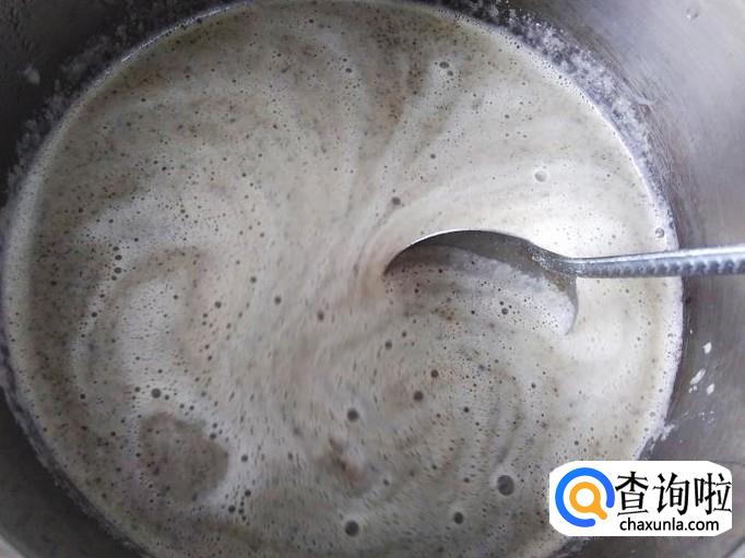 然后把浆糊倒进锅里用勺子一边搅拌一边小火煮。