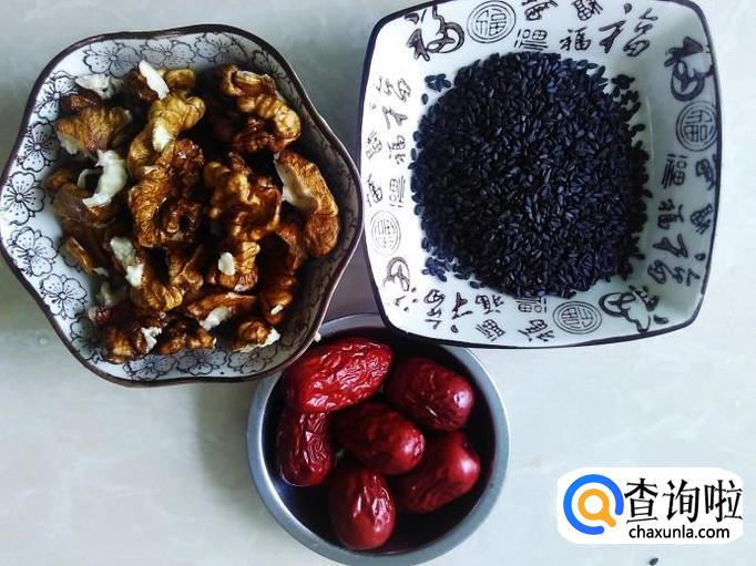 核桃50克,芝麻40克,红枣30克,土红糖适量。