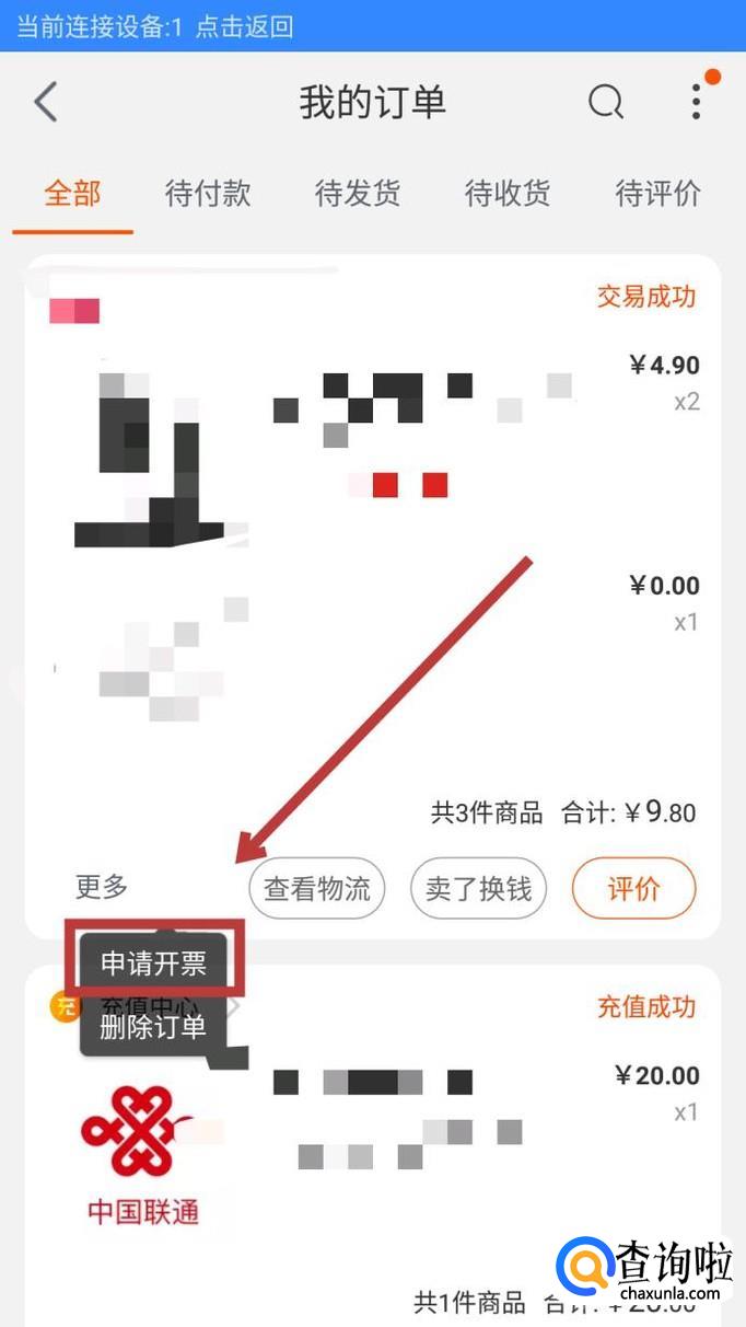 然后在界面下方弹出的选项卡中找到【申请开票】,点击进入。