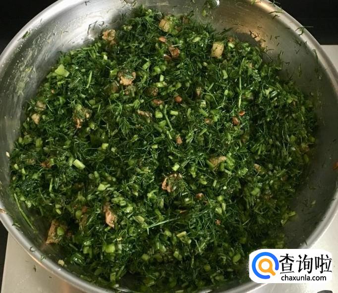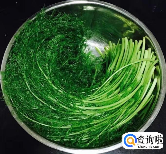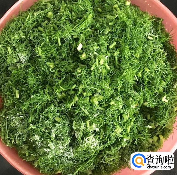 茴香择去老一点的叶子和茎用水反复冲洗干净,控干水分后切成小段放入容器中加入适量的盐搅拌均匀去一下茴香的水分。