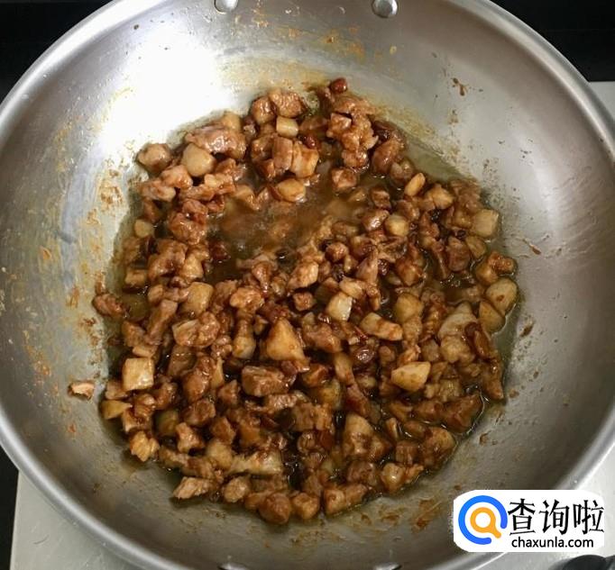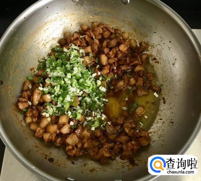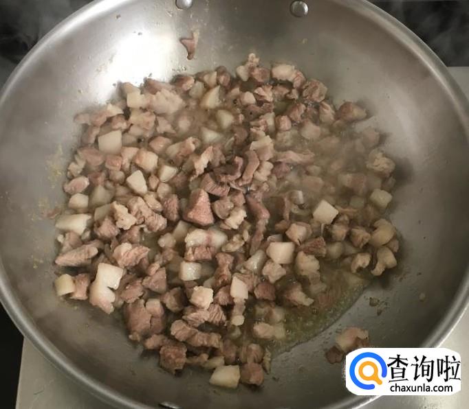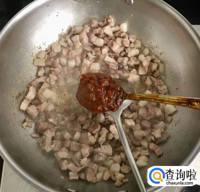猪五花肉适量清洗干净切成肉丁,热锅加入多一点的花生油放入肉丁炒干水分,烹入料酒加两小勺豆瓣酱炒香后关火放凉备用