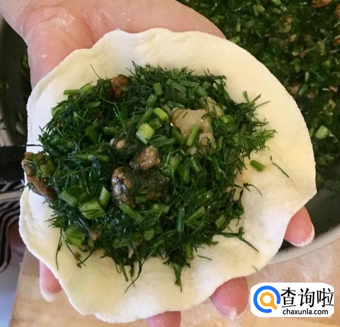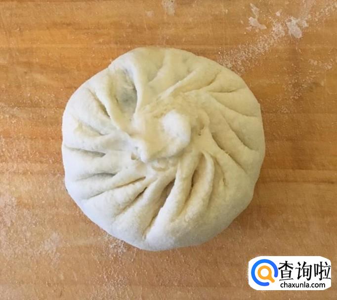 左手托着包子皮中间放入足量的馅料,用右手捏上褶子做成包子胚即可