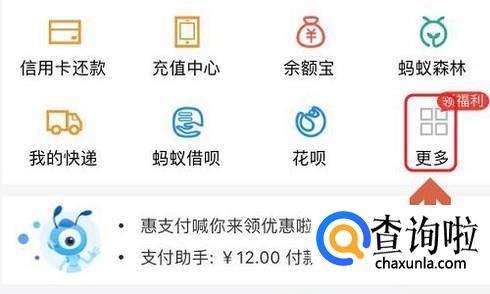 首先我们打开支付宝APP,在首页的页面中间位置点击“更多”这一项,如下图;