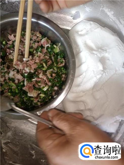 腊瘦肉切末,葱切末,加入少量花椒面拌匀。