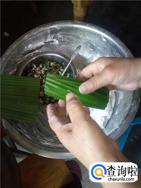 像包汤圆那样把肉馅包入,封好,搓成椭圆,用粑叶裹上。