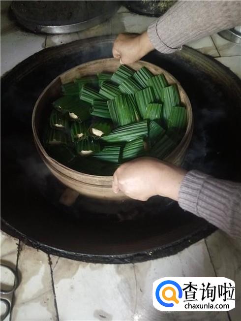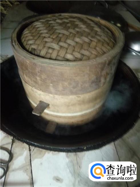 柴锅大火烧水,水开后放入蒸笼开始蒸粑。一般来说蒸个十来分钟就差不多了。