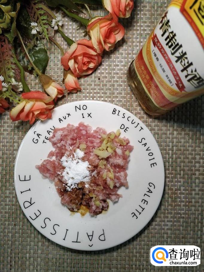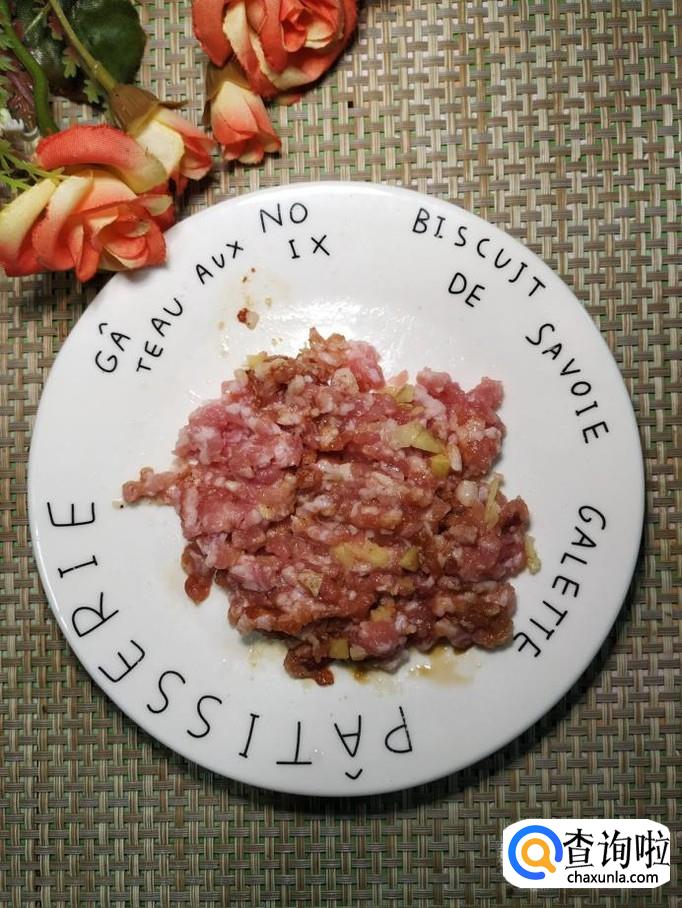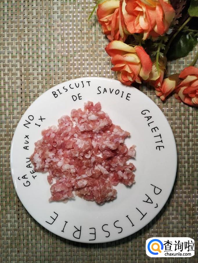 准备适量猪肉,洗净后,剁成碎末,放入适量盐,鸡精,生抽,料酒,淀粉腌制15分钟。