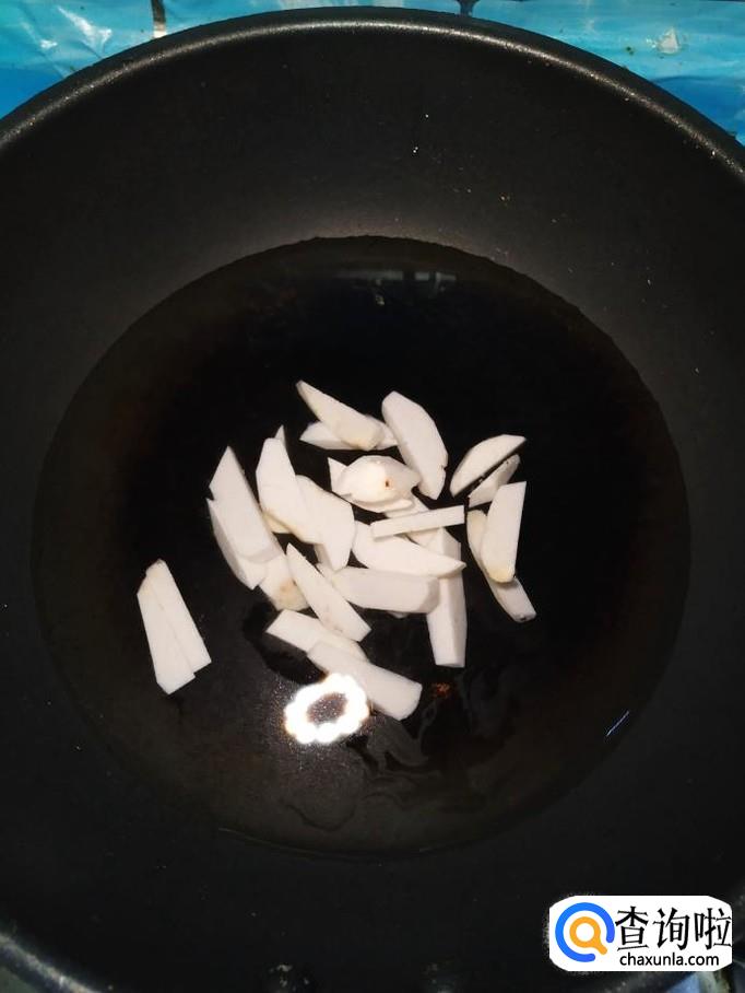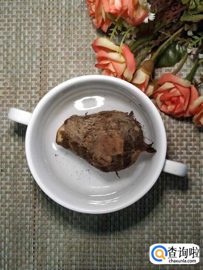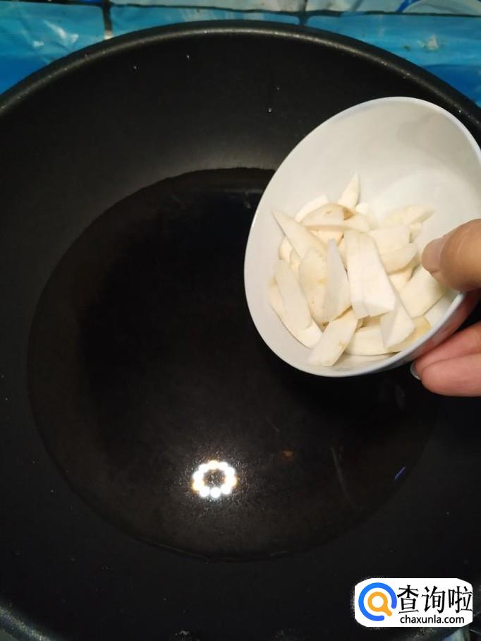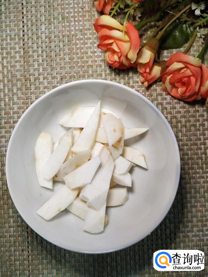 再准备一个芋头,去除外皮,切成条,放入碗中备用,注意,不要让芋头的粘液粘到手上,否则会刺激到皮肤。