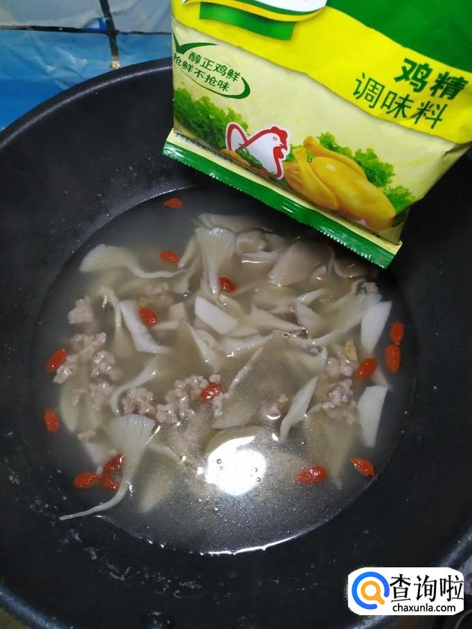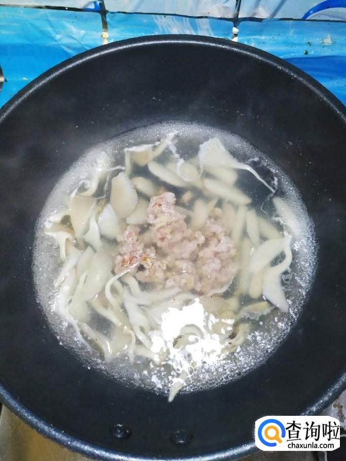 将准备好的蘑菇条也放入锅中,大火将水烧开后转小火,炖5分钟。