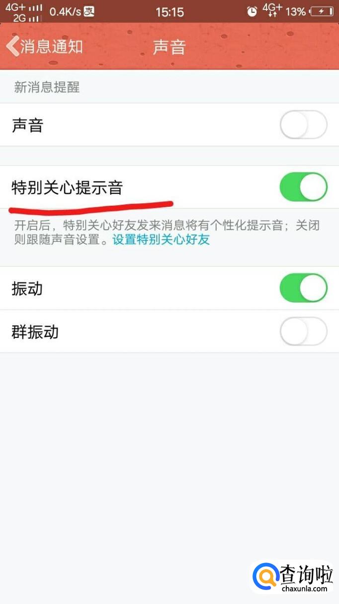 最后,点击“声音”并且将“特别关心提示音”打开即可。