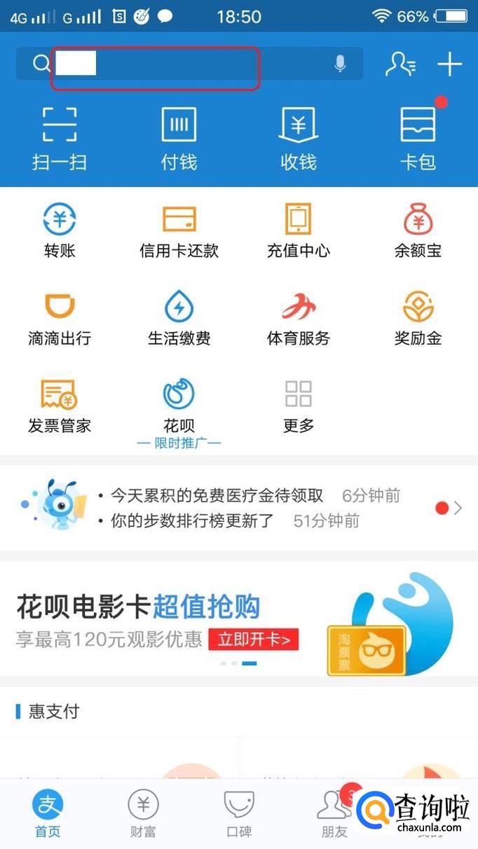 首先,我们打开手机支付宝,如图所示,在软件首页上方搜索栏输入“信用卡”,开始搜索。