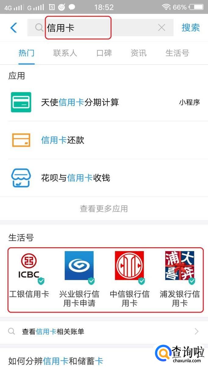 就可以搜索到各家银行信用卡的生活号,如图所示,往右滑动屏幕,可以选择所需要申请的信用卡,我们以工商银行信用卡为例,点击一下“工银信用卡”生活号。