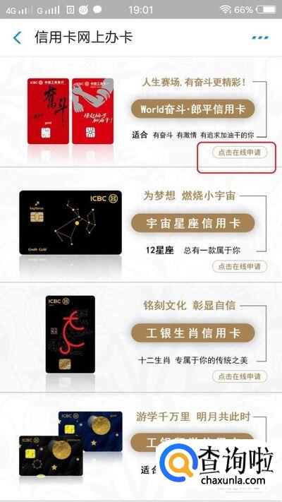 此时,我们进入的是“信用卡网上办卡”页面,如图所示,选择一张适合的信用卡,点击在线申请就可以了。
