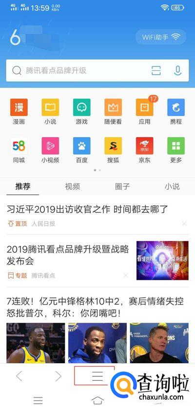 首先打开QQ浏览器,在主界面点击最下面的主菜单按扭。如图所示: